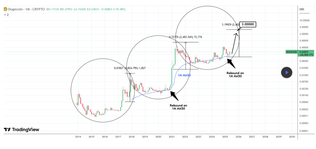 As shown by the Dogecoin monthly candlestick chart shows, Dogecoin bounced off the 1M Moving Average 50 in September 2017 and again in February 2021. Notably, both rebounds marked the final retest zones before the meme coin surged more than 2,400% to new all-time highs.