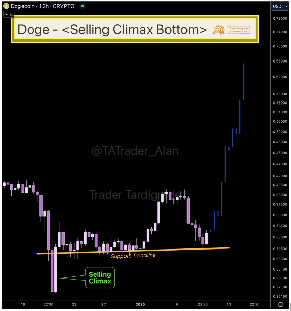 Interestingly, Dogecoin is also exhibiting what looks like the formation of a climax bottom, according to recent technical analysis of price action. This observation comes from crypto analyst Trader Tardigrade, who shared insights into Dogecoin’s price structure and a positive outlook for the king of meme coins.
