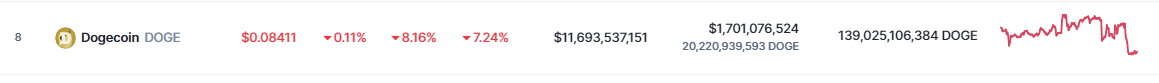 At the time of writing, Dogecoin (DOGE) was smothered in red, trading at $0.0841, down 8.16% in the last 24 hours. The memecoin has been down 7.24% in the last seven days, data from crypto market tracker CoinMarketCap shows.