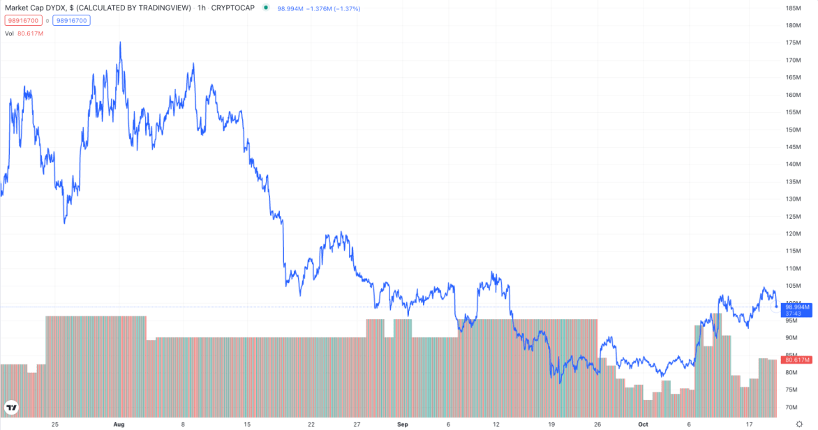 dYdX has seen volatility in its market cap over recent months, and will turn to another added resource, a fiat on-ramp courtesy of Banxa, to help spur future growth. | Source: MARKETCAP: DYDX on TradingView.com