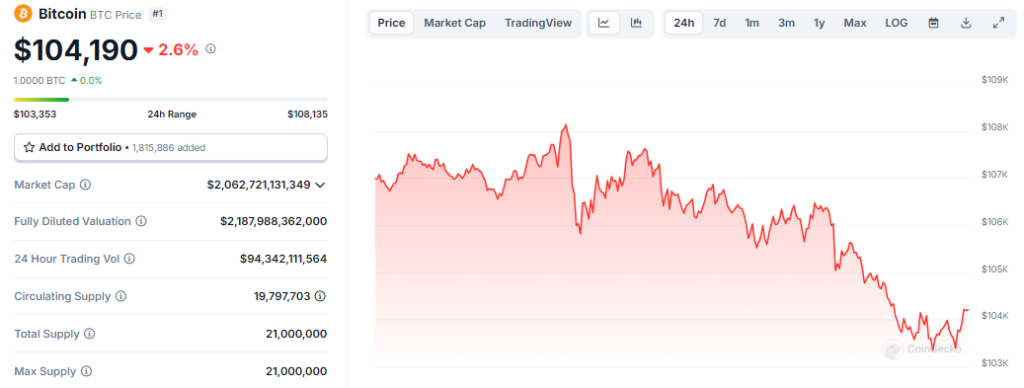 BTC price retreats to $104k in the last 24 hours. Source: Coingecko