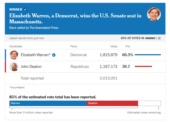 Democrat Elizabeth Warren will serve her third senate term, beating John Deaton, a well-known crypto advocate. Warren, a progressive Democrat, was projected the winner by the Associated Press immediately after counting 50% of the total votes.