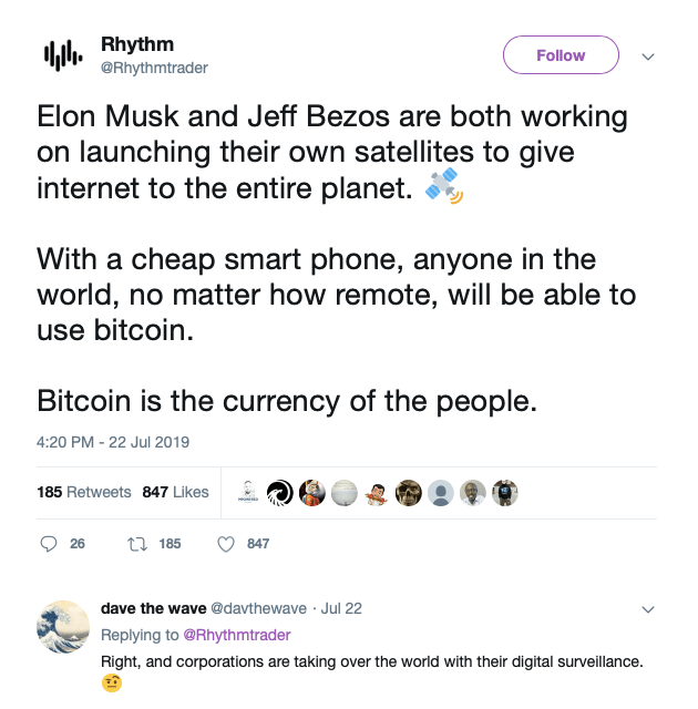 Rhythmtrader believes that universal internet access will allow Bitcoin to truly serve as “the currency of the people” but not everyone agrees with him. Fellow crypto-Twitter analyst Dave the Wave quickly retorted, “right and corporations are taking over the world with their digital surveillance.” Other followers pointed out that Bitcoin has ‘already gone outer space’ and referenced Blocksteam’s satellite and the ability to send Bitcoin via radio waves.