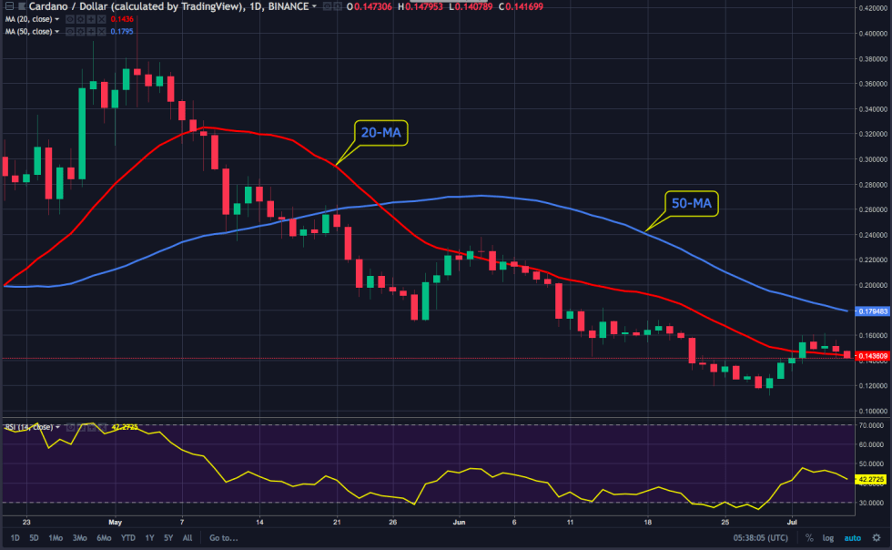 After racking up some impressive gains since June 29th, ADA finally ran out of steam and failed to hold above the bullish trendline at $0.15 and has since dipped below the 20-day MA. At the time of writing, ADA rests on the 100-day MA with support at $0.145 and the overall setup is quite bearish.