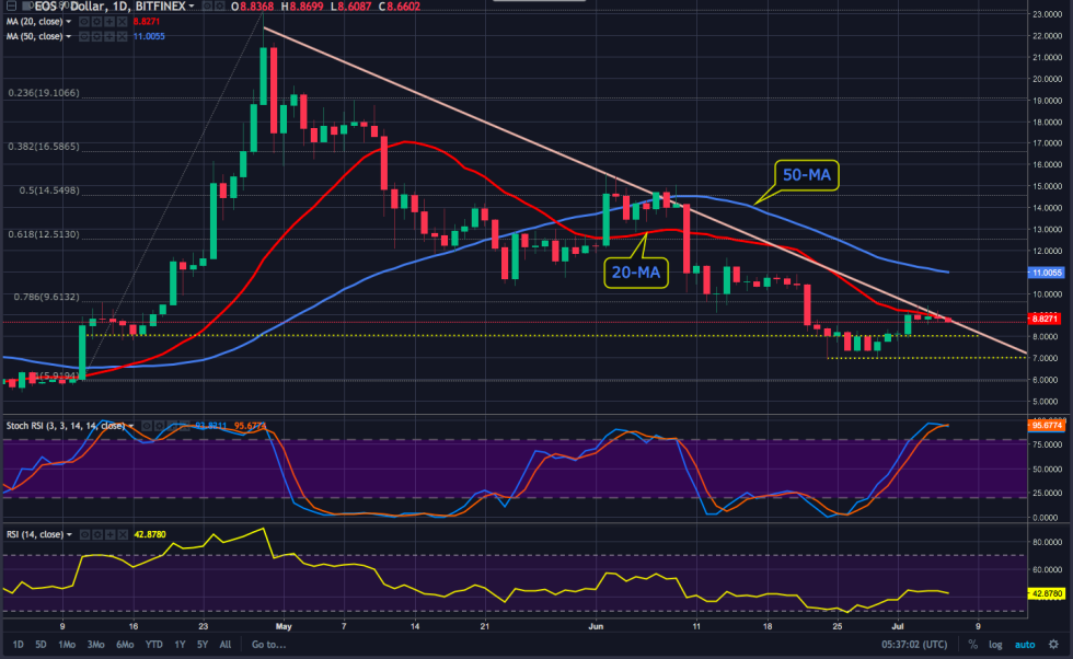 Similar to a host of other alts, EOS currently flirts with the descending trendline where the 20-day MA aligns at $8.40. The cryptocurrency is currently range bound, pinned between $8 and $9 as bulls attempt to hold the current gains from the jump from $8 on July 2nd and bears try to defend the 20-day MA.