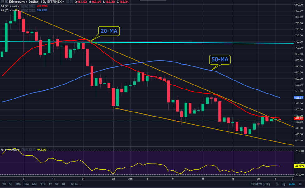 Currently Ethereum exhibits somewhat bullish behavior as it attempts to surpass the descending trendline and has steady support at $458. At the time of writing, ETH peeps ever so slightly above the descending trendline where the 20-day moving average (MA) is also aligned.