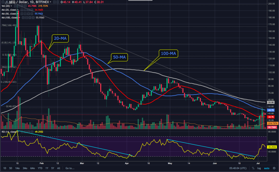 The 50-day MA at $45 is the most immediate resistance for NEO, followed by resistance at the 100-day MA near $56. Below $37, NEO has support at $34, $31 and $30 which also serves as an important psychological barrier turned support. Volume tapered back significantly as NEO pulled back and its possible that the current rally is solely driven by NEO’s positie news as the majority of altcoins remain near yearly lows.