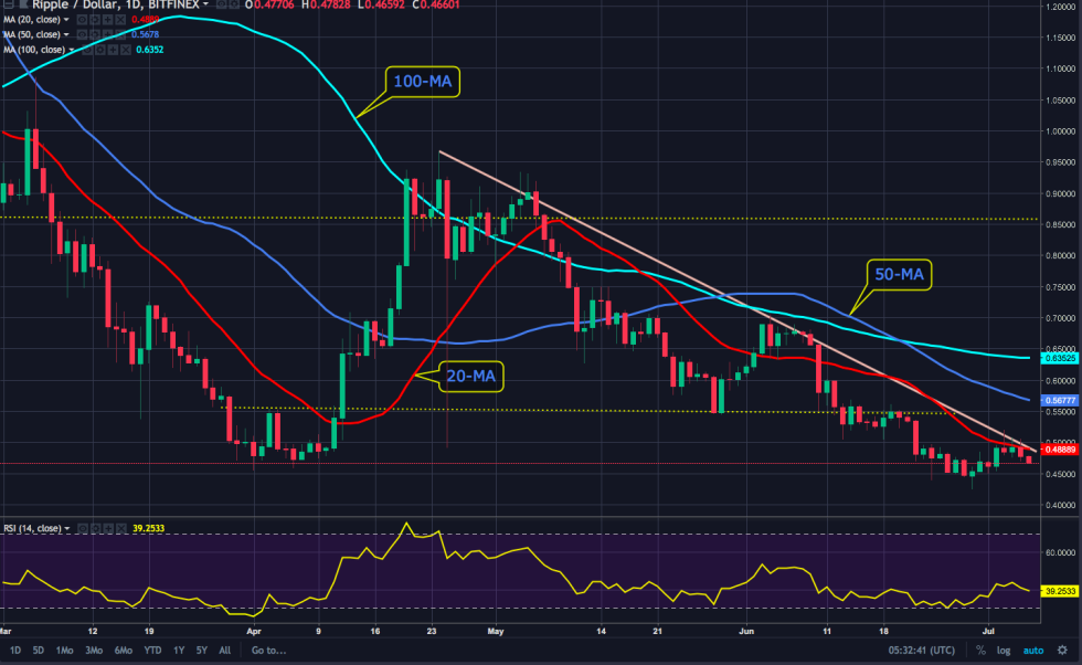 After briefly escaping the descending channel, XRP met resistance at $0.50 and sold its way back under the 20-day MA to the $0.48 support. XRP currently trades at $0.46 with strong support at $0.45 and a glance at the RSI shows frequent turnarounds at the 40.