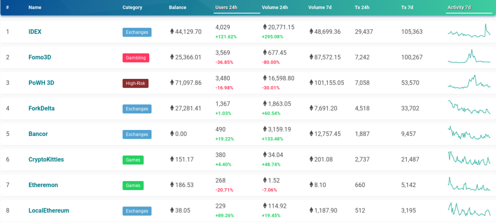Data from monitoring site DappRadar shows Fomo3D and PoWH 3D held the number one and number two spots among DApps July 22, pushing the highest-placed ‘legitimate’ offering – decentralized exchange IDEX – into third place.