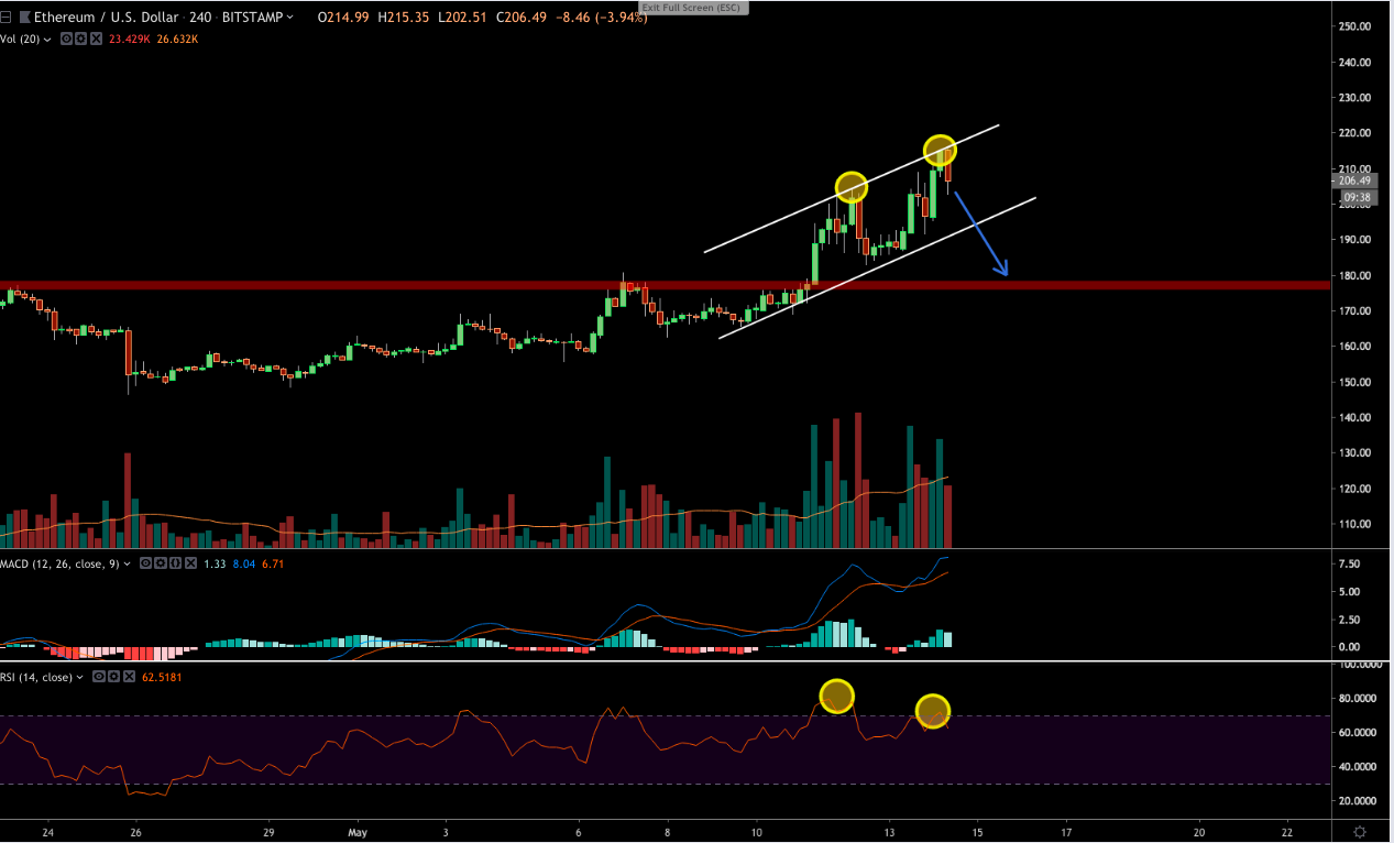 On the 4-Hour ETH/USD chart we can see a worrying trend contradiction between the RSI and the price action. Since May 11, ETH has made 2 significant higher highs including the most recent rally to $215, whilst tracking inside of an ascending channel pattern.