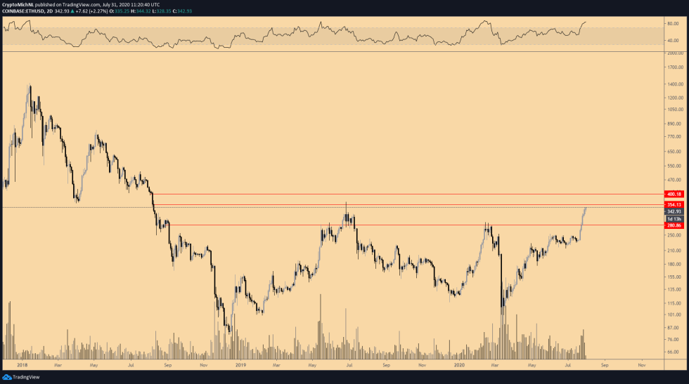 - Ethereum is flashing signs of immense strength as it pushes up towards its high time frame resistance at $350