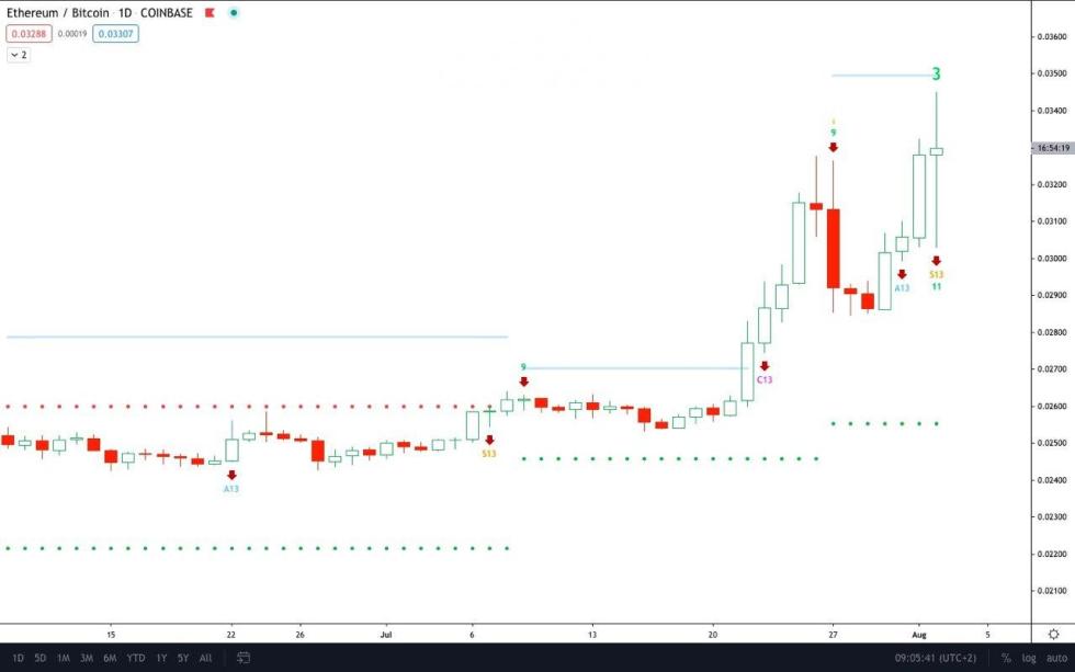 According to a Telegram channel tracking the Tom Demark Sequential, Ethereum is printing a reversal candle on its daily chart against Bitcoin.