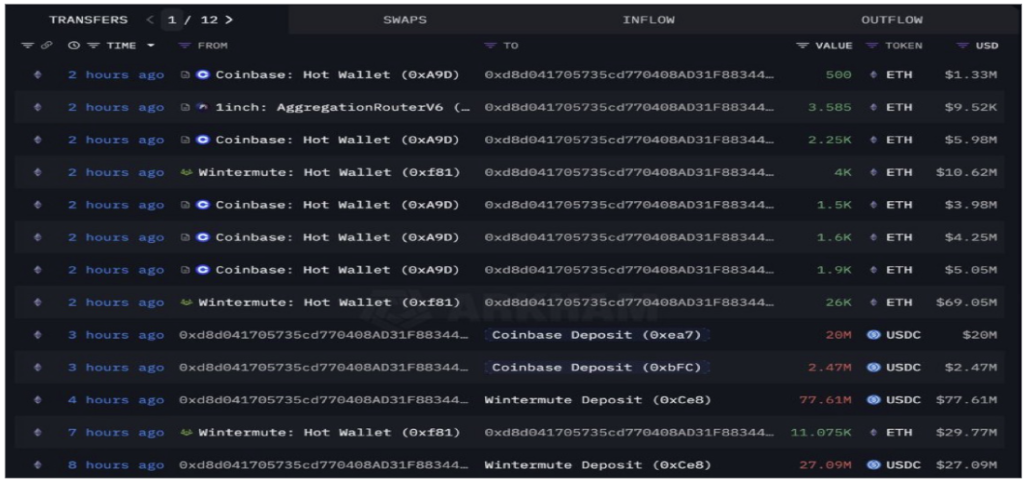 Transaction records also show large inflows of ETH into a single receiving wallet, with high-value transfers coming in quick succession. These included multi-million dollar movements from Coinbase hot wallets and Wintermute’s trading addresses, consolidating tens of thousands of ETH coins in a short window.
