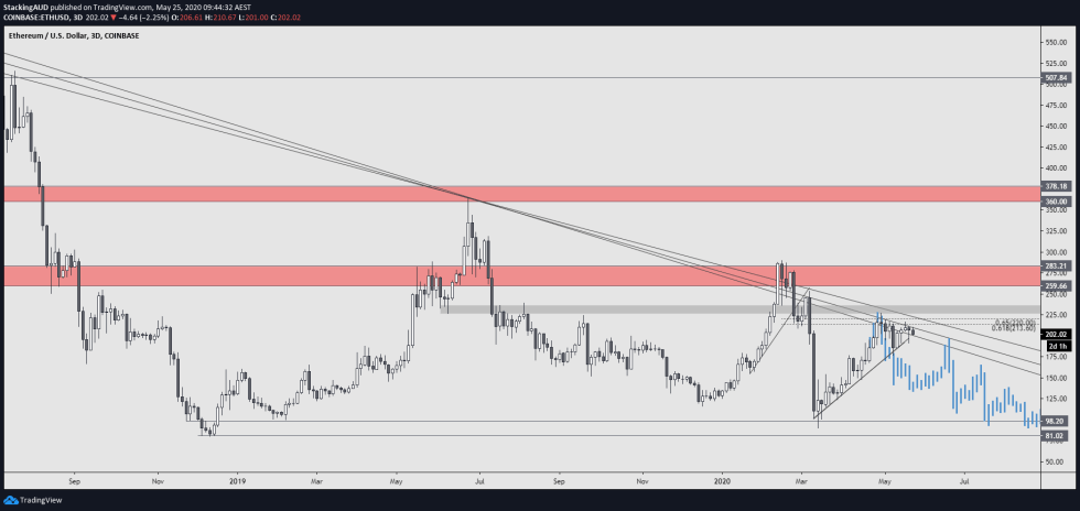 “ETH / USD 3D TF- Marco Bear structure still standing strong, bulls rally up failed to break out… Selling around ETH ~$200 is still a gift,” he stated while pointing to the chart seen below.