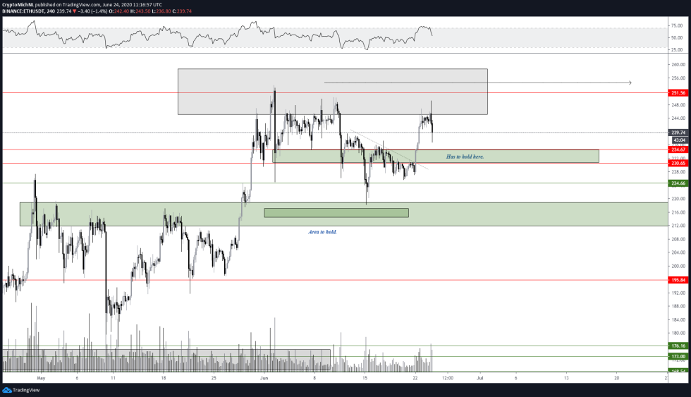 “Well, the $250 barrier still acting as resistance, while BTC is also inside the range. $228-230 should hold, might wick to there and close above $234 in general. Structure still valid.”