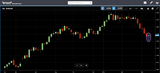 This graph shows each candlestick as an entire week. As you can see, the current candle for this week shows a long wick down but has already turned green. This formation is commonly known as a “bullish hammer.”