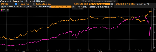 At the same time, we can see that the Italian situation has also affected American investor’s perception of their own Fed. The big question since the beginning of the year has been how many times will the Fed hike rates by the end of 2018?