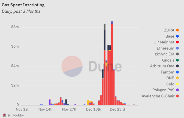 In terms of gas fees, some networks paid over $1 million in gas expenses in December, when the inscription frenzy was at its peak. Notably, Avalanche and Arbitrum reported gas fees of more than $5 million and $2 million, respectively, on December 16.