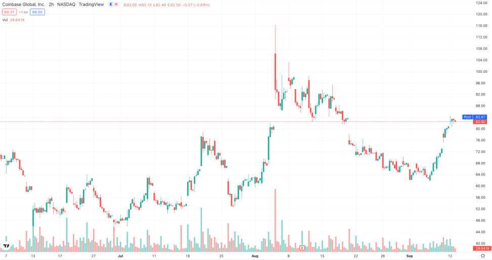Coinbase (COIN) has had a rocky ride since going public to start the year. | Source: NASDAQ: COIN on TradingView.com