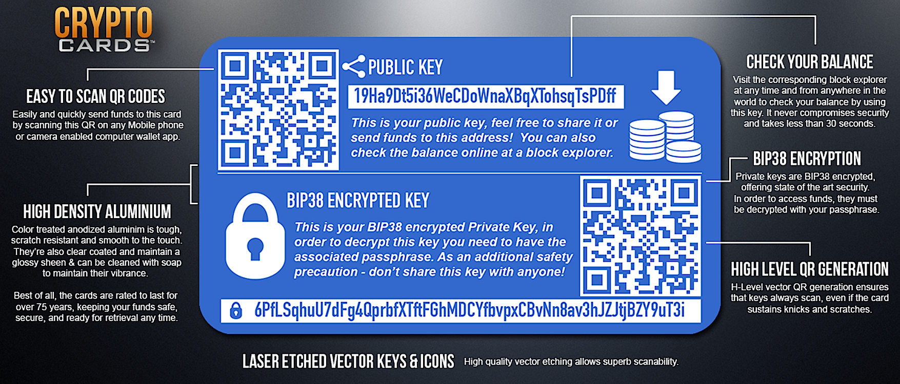 For those who want to use a CryptoCard for an online or desktop wallet that they have, we also offer Public only cards, which is essentially a laser etched bitcoin receive address with a large, beautiful QR code that’s easy to scan by any device. The best Bitcoin wallet is the one you have on you, even better is that these will allow you to receive bit coin even when your phone’s wallet is out of batteries.