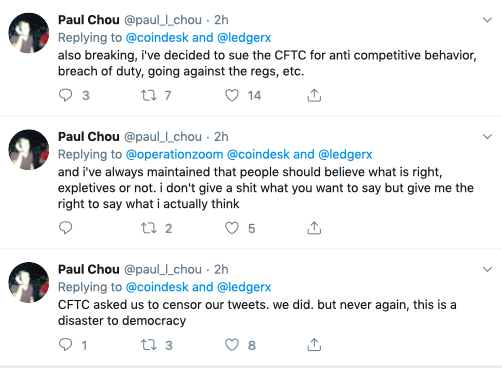 Chou alleges that the CFTC asked him to censor LedgerX’s tweets and he admitted that they did but will “never again, this is a disaster for democracy”.