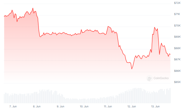 The crypto markets reacted immediately and dramatically to the FOMC’s decision and later Powell’s comments. After the disclosure, Bitcoin—which had skyrocketed to an astounding $70,500 on Tuesday—dropped to $67,220.