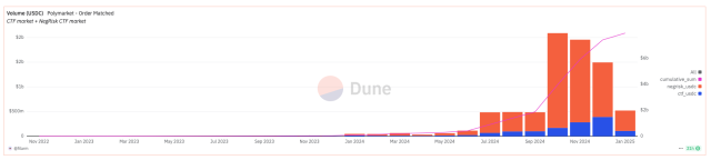 D’après les données sur Dune, constatons que Polymarket est confronté à une très forte hausse de la tendance, les interactions avec les différents contrats explosant à l’échelle journalière, passant de 1 200 portefeuilles en mai 2024 à plus de 60 000 portefeuilles, ce qui témoigne d’une démocratisation de l’outil au sein même de l’industrie, bien que cela ne soit pas suffisant pour parvenir à une démocratisation totale.