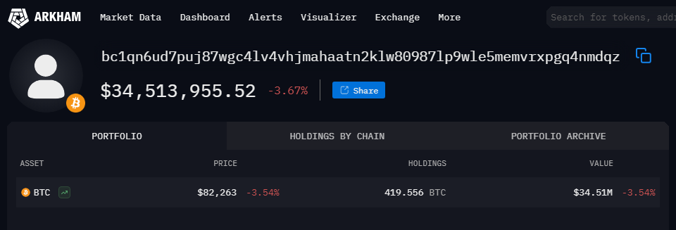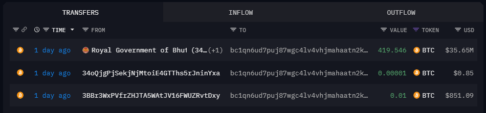 Based on reports from Arkham, a blockchain analytics platform, two separate wallets believed to belong to the Bhutanese government participated in the transfer. The main Bitcoin holding wallet sent 377.8 BTC ($32.11 million) to a new address identified only as “bc1qn6.” A second wallet, labeled “34oXLr,” contributed an additional 41.7 BTC ($3.5 million) to the same destination.