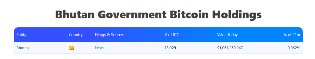 The Royal Government of Bhutan owns significant Bitcoin holdings, despite recent sales. Bhutan, based on Bitcoin Treasuries data, owns 13,029 BTC at a value of $1,061,269,247. This puts the nation fourth in total Bitcoin owned among countries, just behind El Salvador.