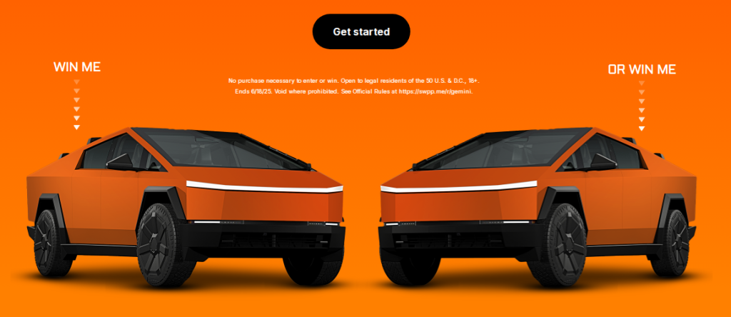 Gemini linked this stunt to a sweepstakes in the US running from May 19 to June 18, 2025. Anyone 18 or older can enter. Two winners will each get a Cybertruck “Cyberbeast” valued at $113,735. They’ll also receive $2,000 for travel and cash to help cover taxes.