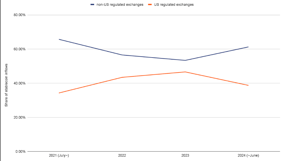 Share of stablecoin inflows to exchanges regulated in the United States and those not regulated in the US. Source: Chainalysis