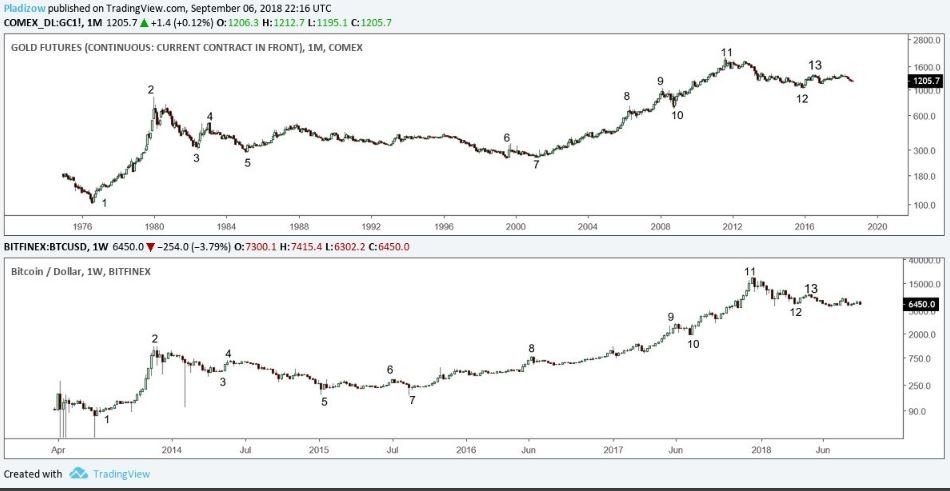 Bitcoin, being a fairly nascent asset, reveals serious similarities to the yellow metal in its performance. As seen on the chart below, the resemblance is uncanny.