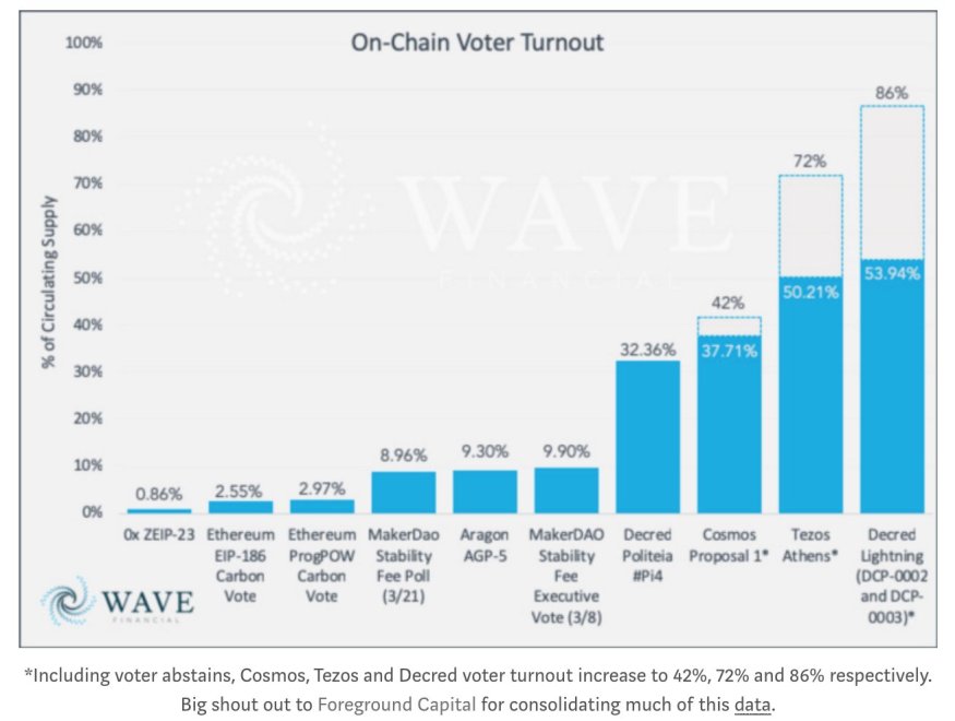Additionally, and perhaps a greater factor, is that Decred, Cosmos, and Tezos, all provide voters with direct incentives to participate via Proof-of-Stake. So the assumption that token holders will participate in on-chain governance votes purely through their passive ownership seems flawed.