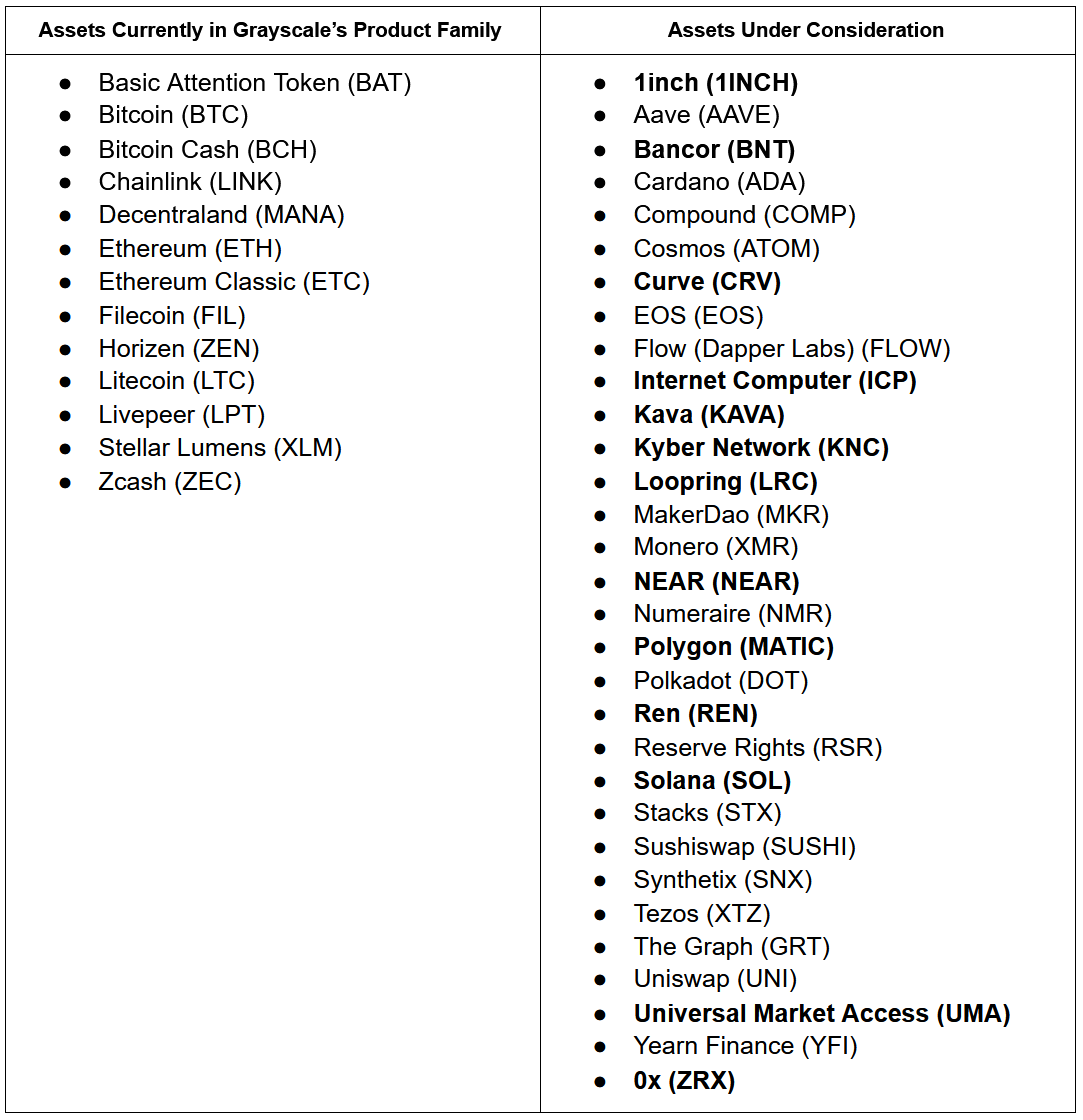 Of the initial 13 coins under consideration, it remains to be seen how many Grayscale will actually launch. The asset manager stressed that the creation of a new fund is incredibly complicated, and that it “requires significant review and consideration and is subject to substantial internal controls, sufficiently secure custody arrangements, and regulatory considerations.”