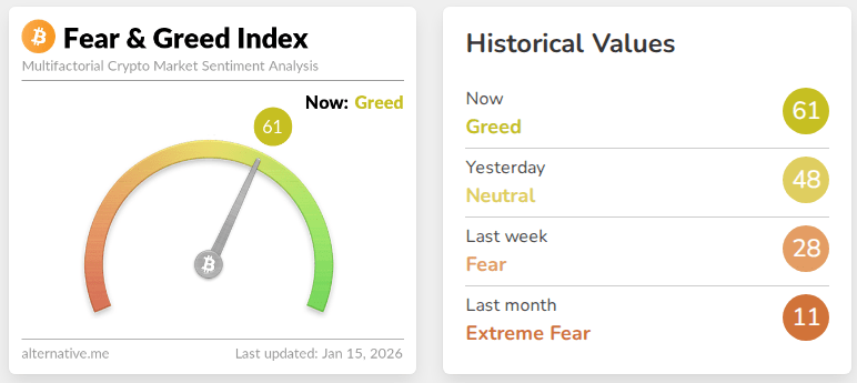 According to the Crypto Fear & Greed Index, investor mood has swung back toward optimism, registering a score of 61 on Thursday. That is the first time the gauge has moved into the “greed” zone since the large market fallout on Oct. 11, when roughly $19 billion in liquidations drove many traders from altcoins. The index had climbed to 48 just a day earlier, moving out of “neutral” and signaling a quick change in sentiment.