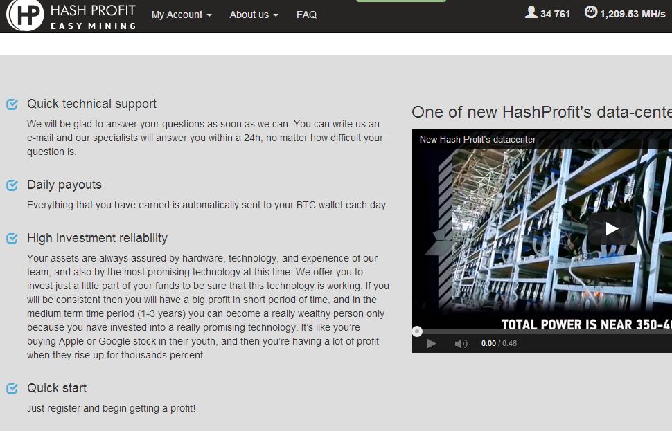 Hash Profit Easy Mining Company opened last May with the main objective to deliver the community an easy and profitable way to mine crypto currencies. In fact, the company provides costumers an ultimate super easy and comfortable way of mining while taking care of energy costs and any other issues with the hardware and software that can sometimes cause you serious headaches.