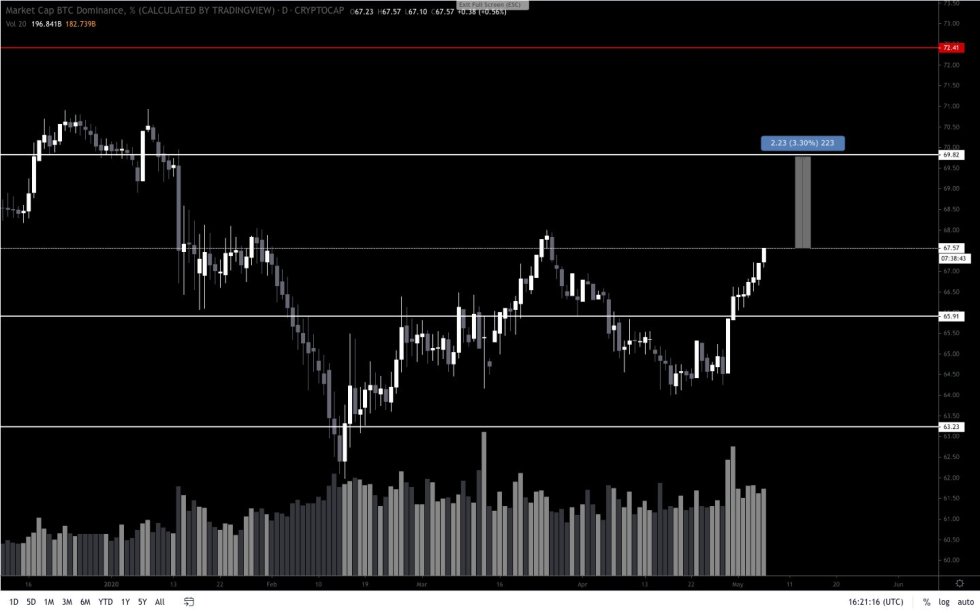 “BTC Big jump today. A potentially very painful situation developing if it breaks out towards the next resistance. Each 1% rise in BTC.D roughly equates to a 6-12% drop against the BTC pairings for alts,” he noted.