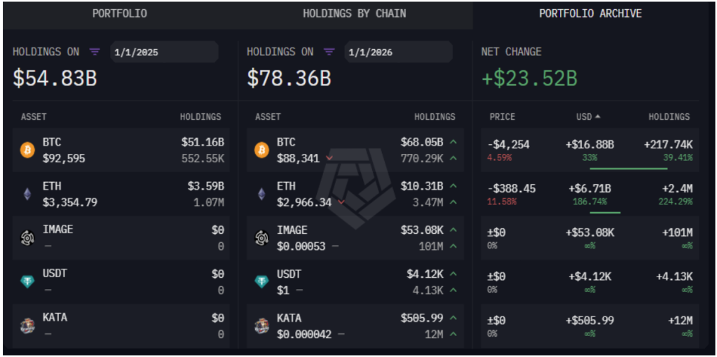 Crypto was at the forefront of BlackRock’s investment strategy in 2025. According to data from on-chain analytics platform Arkham Intelligence, BlackRock’s on-chain cryptocurrency holdings at the start of 2025 were $54.83 billion. By January 1, 2026, that figure had risen to about $78.36 billion, representing a net increase of roughly $23.52 billion over the course of the year.