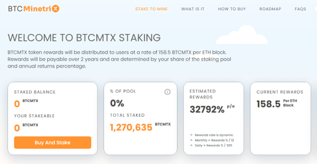 Moving beyond the traditional mining process involving physical mining equipment, Bitcoin Minetrix is a cloud mining platform that enables users to mine Bitcoin without personally owning BTC. The platform is powered by its ERC-20 token named $BTCMTX. Token holders can stake $BTCMTX to earn mining credits, and then use those credits to mine BTC and subsequent profits.