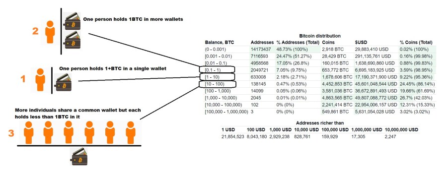 But the situation gets trickier in the second scenario, in which one person can possess a total amount of 1+ Bitcoin but in several different addresses. For example, one might hold 0.8 BTC in one wallet and 0.2 in another one, or keep 0.1 BTC each in 10 different wallets. In these cases, the addresses would have less than one coin, so they should be displayed in other rows of the distribution table – the ones that we initially ignored. Counting those who hold at least 1BTC in the second scenario would be much more difficult, as they possess any of the 98% of addresses that contain less than 1 BTC.