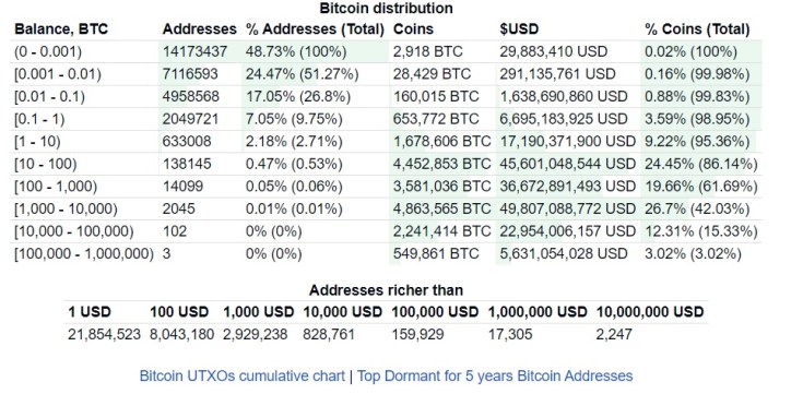 Anyway, based on the distribution table, we can be sure that between 500,000 and 1 million people have at least 1 BTC.