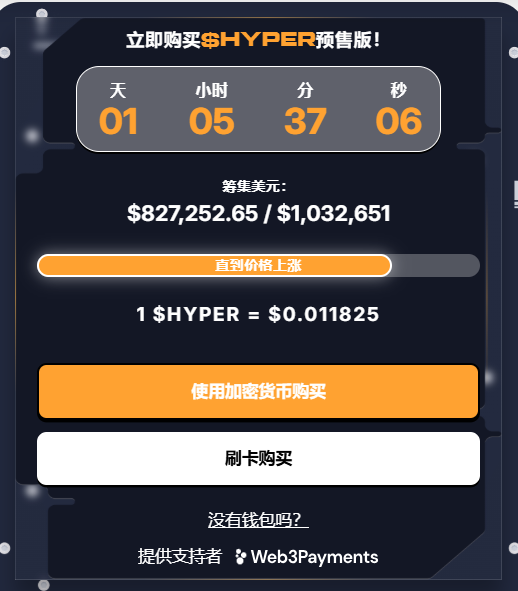 - 預售:自上線以來已籌集超過 200 萬美元,一枚 $HYPER 代幣售價為 0.0122 美元。價格每三天上漲一次,直至各階段配額已售罄。