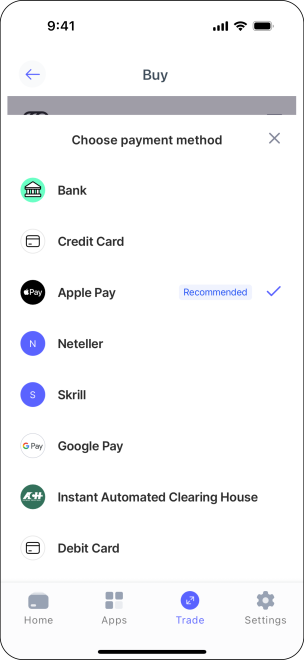 โดยคุณจะถูกนำไปยังหน้าซื้อในแอปของเรา ซึ่งคุณสามารถตั้งค่าการซื้อ Bitcoin และจับคู่กับผู้ให้บริการบุคคลที่สามที่เชื่อถือได้