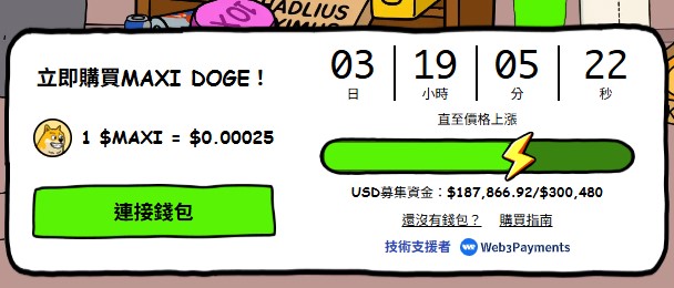 Maxi Doge 募資已達398萬美元,表現呼應DOGE與WIF近一週的強勢上漲趨勢。目前預售價為$0.000268。