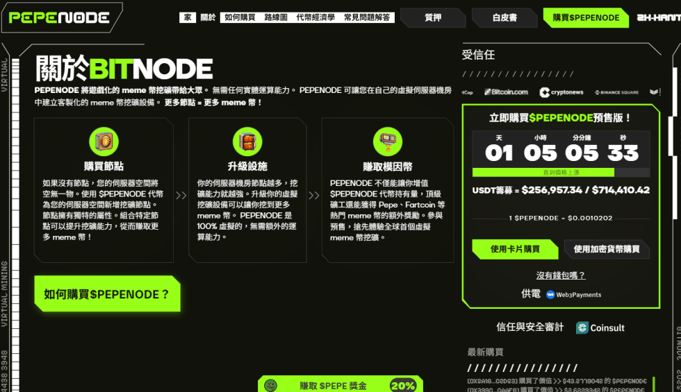 如果要購買,請僅在PEPENODE官方網站上進行。若要手動輸入網址,請使用 https://pepenode.io/。預售階段常成為詐騙者目標,容易遇到假網站。