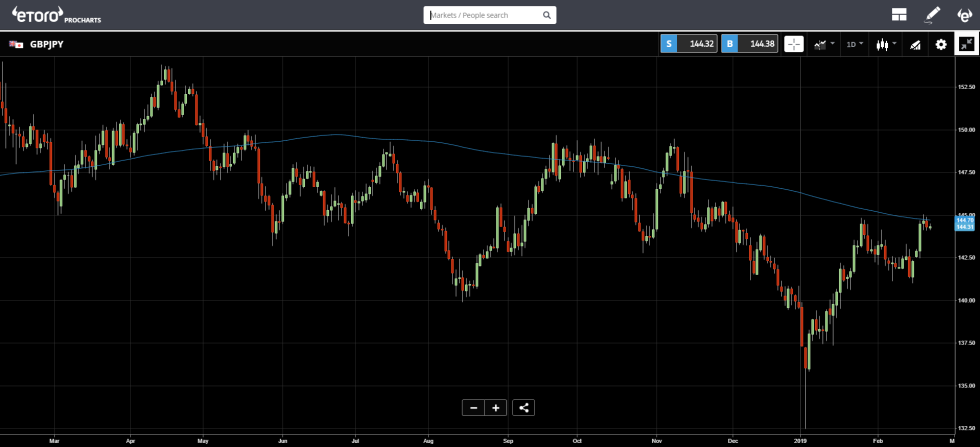 The Pound has been falling pretty steadily since May. Here we can see the GBPJPY kissing her 200-day moving average (blue line).