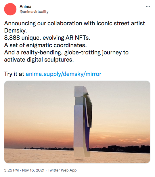 The Coinbase-backed metaverse company Anima, in collaboration with the modern artist Demsky, launched an AR platform along with their largest augmented reality (AR) NFT project yet called Mirror. They have described it as a “digital sculpture” and a “gateway to the metaverse.”