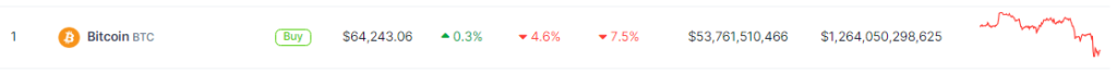 At the time of writing, Bitcoin was trading at $64,223, down 4.6% and 7.5% in the daily and weekly timeframes, data from Coingecko shows.