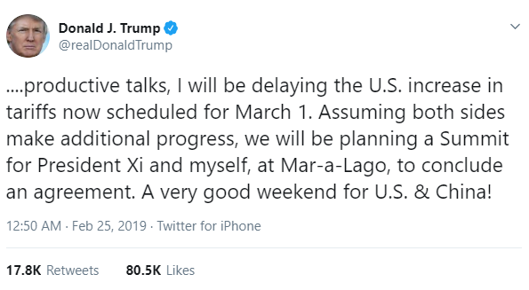 Stocks are flying today on the news that President Trump has postponed the March 1st deadline for a US-China trade deal.