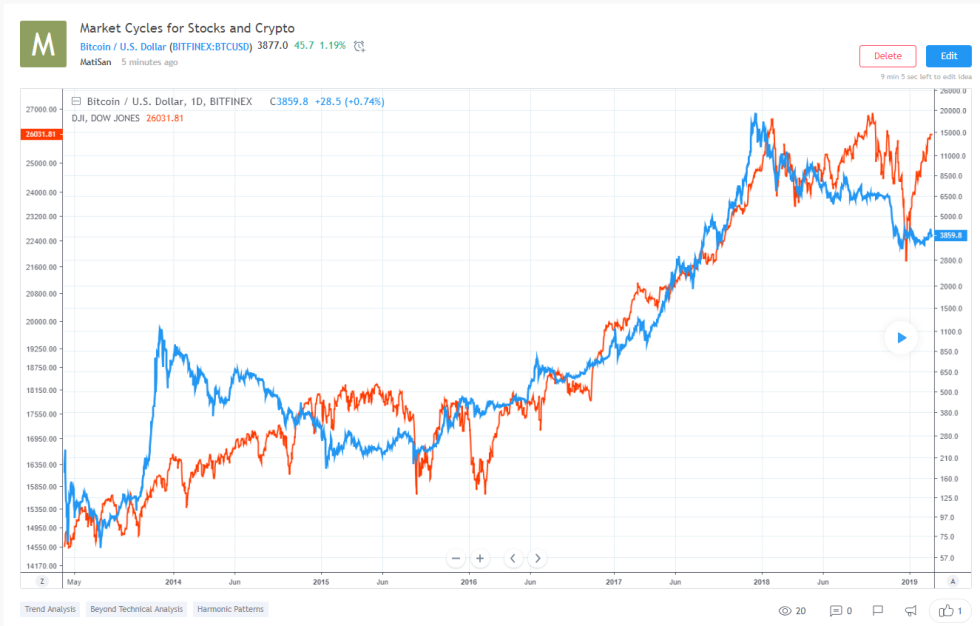 With bitcon in blue and the Dow Jones in red, we use a double X-axis to determine if the direction of travel is proportionate. For further accentuation of the magnitude of these moves, I’ve set both lines to a logarithmic scale.